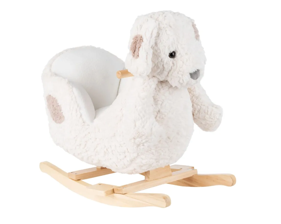 Balancín mecedora de animales con base de madera y asiento cómodo, ideal para niños de 12 meses hasta 30 kg. Favorece el desarrollo de equilibrio y motricidad, con soporte para manos y pies, respaldo blando y cinturón de seguridad. Fabricado con materiales de alta calidad: exterior 100% poliéster, base de madera de álamo, relleno 100% poliéster y chasis metálico. Presentación en caja de regalo. Dimensiones: 58x28,5x52 cm.