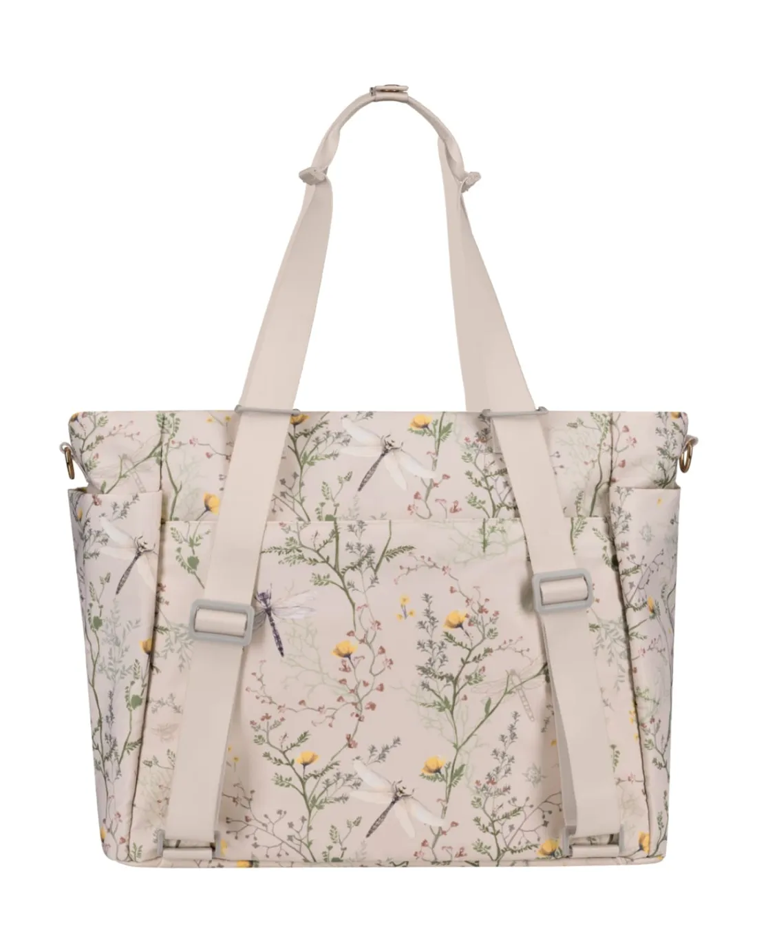 El bolso maternal Florence Secret Garden es el compañero perfecto para mamás y papás que buscan organización, estilo y comodidad. Diseñado en tonos beige, verde y gris con delicados estampados de flores y libélulas, aporta un aire moderno y elegante que combina con cualquier cochecito o silla de paseo.
