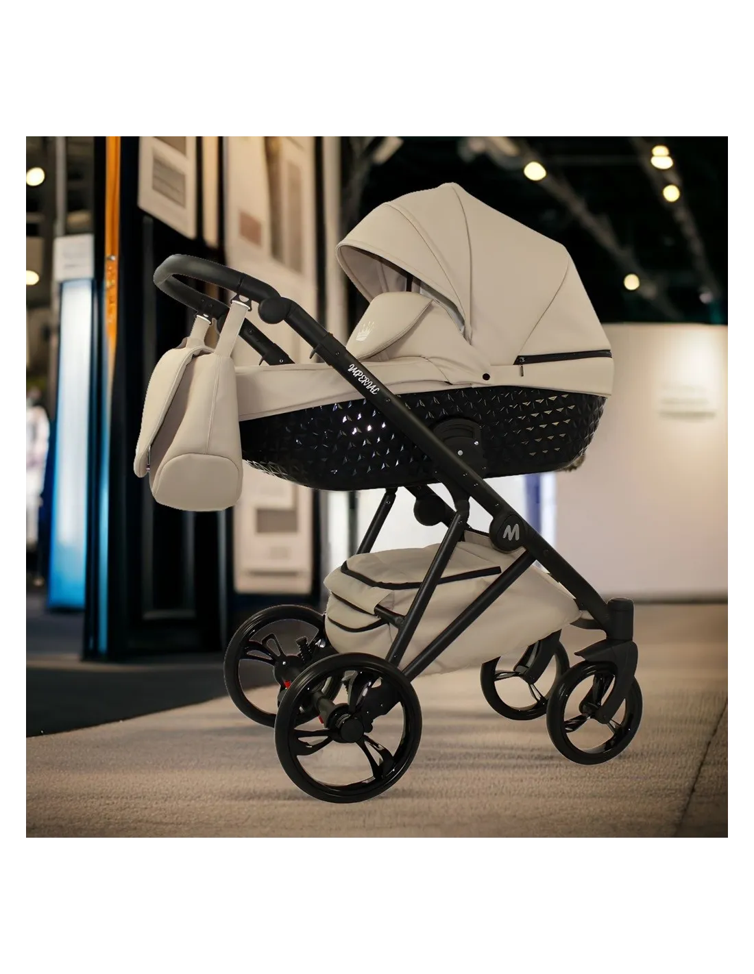 MOMMO IMPERIAL è una carrozzina lussuosa e moderna con bellissimi dettagli. La sua base per navicella è realizzata in resistente materiale PVC, con bellissime forme a diamante. Si caratterizza per essere un modello comodo, con molta ammortizzazione e ruote antiscivolo.